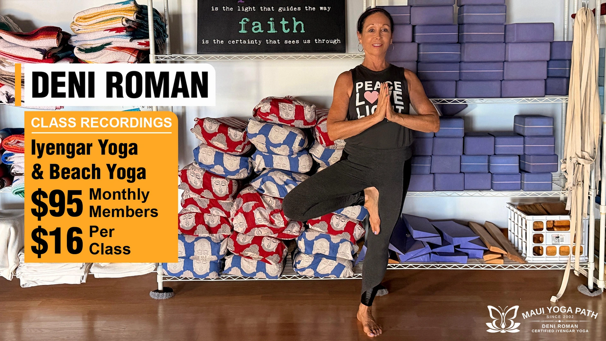 Deni Roman is the founder of Maui Yoga Path (est. 2002), a beachfront yoga studio on Maui. She is an experienced Iyengar Yoga teacher who has spent decades studying directly with the Iyengar family in Pune, India.